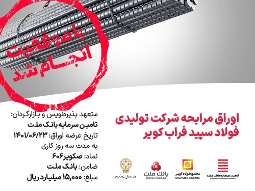 به گزارش روابط عمومی تامین سرمایه بانک ملت، تامین مالی شرکت تولیدی فولاد سپید فراب کویر در حالی از بستر بازار سرمایه و با انتشار اوراق مرابحه انجام شد که تعهد پذیره نویسی و بازارگردان این اوراق بر عهده شرکت تامین سرمایه بانک ملت است. اوراق مزبور با نام و از عمر 5 سال برخوردار است و به منظور تامین سرمایه در گردش به منظور خرید مواد اولیه منتشر شد. همچنین نرخ اوراق 18 درصد و مقاطع پرداخت سود دورهای، هر 6ماه یکبار خواهد بود.ضامن این اوراق، بانک ملت است. همچنین شرکت کارگزاری بانک ملت عاملیت فروش و شرکت سپردهگذاری مرکزی اوراق بهادار و تسویه وجوه عاملیت پرداخت این اوراق را بر عهده دارند.
