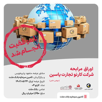 به گزارش روابط عمومی تامین سرمایه بانک ملت، تامین مالی شرکت کارنو تجارت یاسین در حالی از بستر بازار سرمایه و با انتشار اوراق مرابحه انجام شد که تعهدپذیرهنویسی و بازارگردانی این اوراق بر عهده شرکت تامین سرمایه بانک ملت است. اوراق مزبور با نام و از عمر 30 ماه برخوردار است و به منظور تامین سرمایه در گردش به منظور خرید کالای مورد نیاز خدمات بازرگانی منتشر شد. همچنین نرخ اوراق 18 درصد و مقاطع پرداخت سود دورهای، هر 3 ماه یکبار خواهد بود.