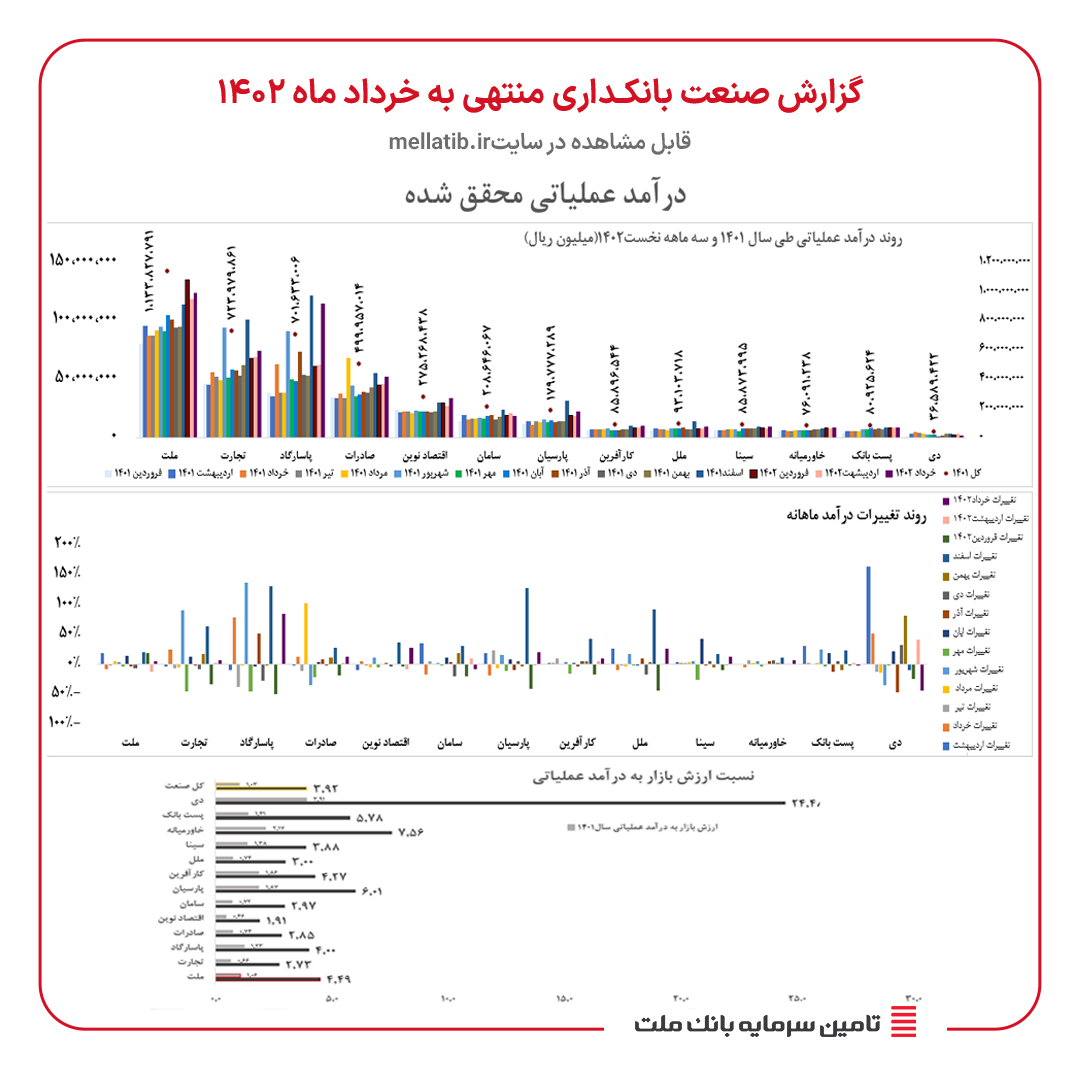 📌 در خردادماه ۱۴۰۲، مجموعا ۴۸ همت درآمد عملیاتی توسط ۱۳ بانک پذیرفته شده در بورس و فرابورس محقق شده است که به ترتیب بانکهای ملت ۲۵ درصد، پاسارگارد ۲۳ درصد، و تجارت ۱۵ درصد بیشترین سهم را به خود اختصاص داده٬اند.📌 ۱۳ بانک بورسی و فرابورسی در سه ماهه اول سال جاری، معادل ۳۱ درصد از کل سال ۱۴۰۱ درآمد عملیاتی محقق کردهاند.